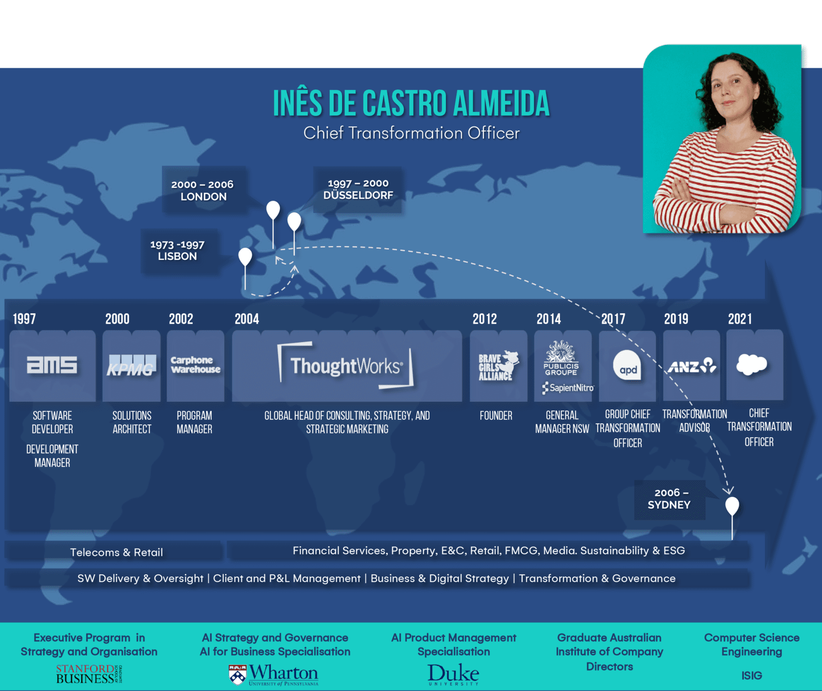 With a wealth of experience spanning over 26 years, Inês held senior positions at companies such as Thoughtworks, Salesforce, and Publicis Sapient, where she advised hundreds of executive customers on digital- and technology-enabled Business Strategy and Transformation.